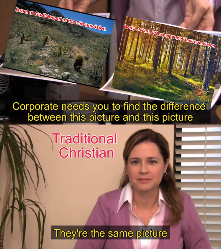After finishing my post on the many differences between the Israel of God (and their Gospel of the Circumcision) and the body of Christ (and our Gospel of the Uncircumcision) — which you can find here — and being told by someone who read it that they still can’t see the clear pattern of differences between the two groups and our respective Gospels (and what the different outcomes of believing those two Gospels are), all I could think of was this meme from The Office.