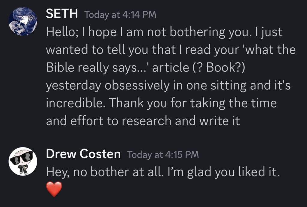 Since publishing the book, I’ve sent it (or variations of it which contain the same information) to thousands of different Christians, with many of them promising to read it and send me a written refutation of the scriptural interpretations and arguments I made in it (and some of these Christians are the type to do immense amounts of research and then write massive volumes and/or create long YouTube videos about why other theological views they disagree with are incorrect). Well, over the years, I’ve received exactly zero refutations of the book. To be fair, I received a few misguided attempts at refuting the first two or three points I made in the first chapter before they gave up, with many others simply sending me links to other articles, videos, or books that they mistakenly believed refuted whichever core doctrine(s) we’d been discussing (or simply quoting a Bible verse or two they assumed proved us wrong, forgetting that we already agree with their “proof texts,” even if we interpret them differently), but had they taken the time to read the whole thing before writing what they did or just sending me random links (as I advised them to do in its introduction), they’d have discovered that every argument they (or the creators of said articles, videos, and books) made was already answered and refuted thoroughly further on in the book (sometimes in the very paragraph which came after the one they stopped reading at, ironically enough).